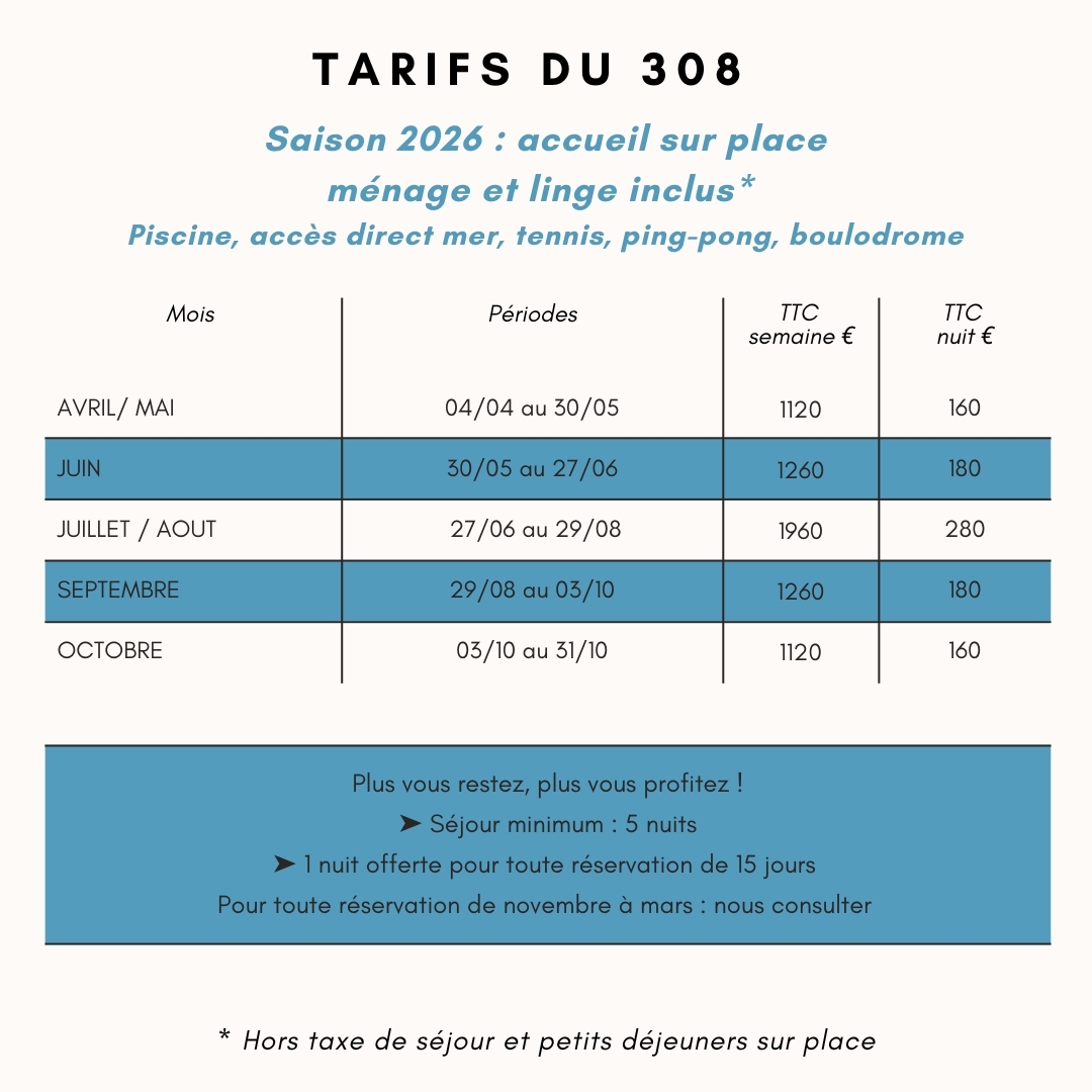 Notre appartement le 308 est entièrement équipé pour répondre à tous vos besoins et vous apporter un maximum de confort :